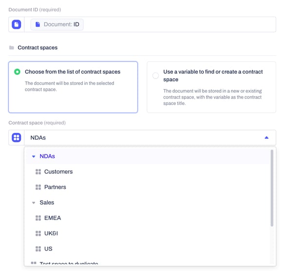 Examples of this could be to create a new space per counterparty or per contract owner. However, to avoid cluttering your account with too many contract spaces, we’d recommend you go with the simple option first and create a few high-level spaces manually that you select statically in here.